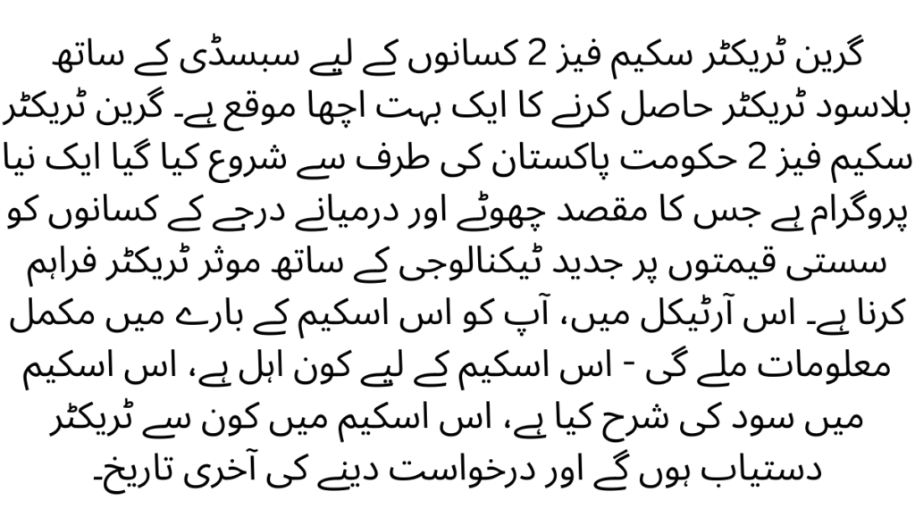 Green Tractor Scheme Phase 2 is a very good opportunity for farmers to get interest free tractors with subsidy.Green Tractor Scheme Phase 2 is a new program launched by the Government of Pakistan with the aim of providing efficient tractors with modern technology to small and medium farmers at affordable prices. In this article, you will get complete information about this scheme – who is eligible for this scheme, what is the interest rate in this scheme, which tractors will be available in this scheme and the last date for application.